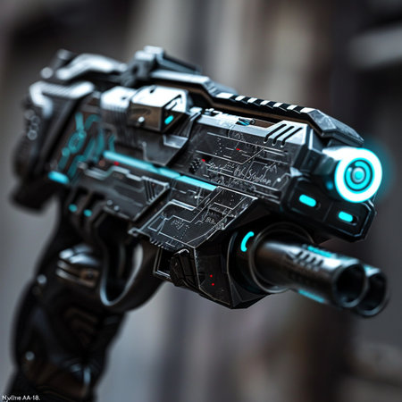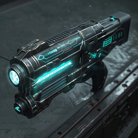 Futuristic blaster gun with chipped paint resting on a metallic wall