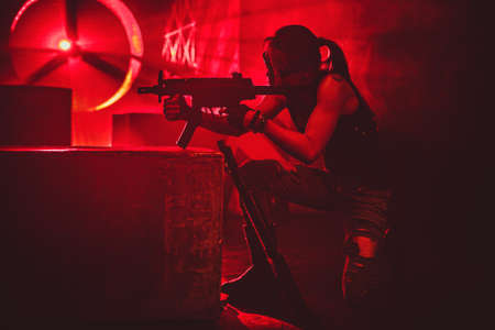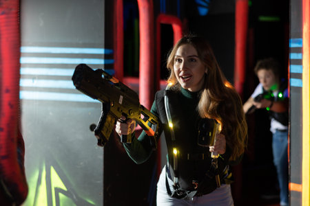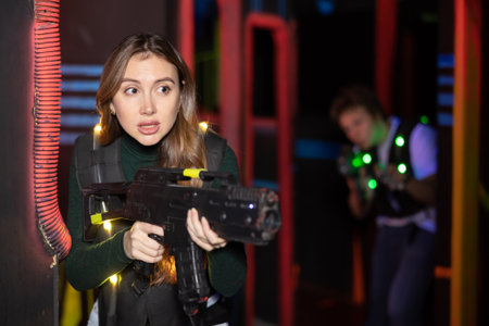 Portrait of young positive smiling girl took aim colored laser guns during laser tag game in labyrinth