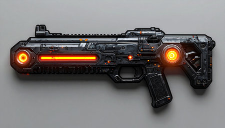 A high-tech plasma rifle, humming with contained orange energy, lies ready for action. This piece of advanced military hardware is a concept for the next generation of futuristic warfare, perfect for video games, sci-fi films, or cyberpunk narratives.
