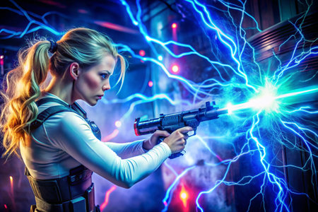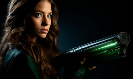 Woman in retro style sci-Fi movie shoots out laser weapons