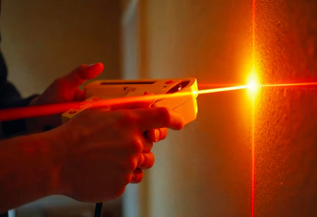 Hand holding digital laser tool projecting horizontal and vertical red lines on wall