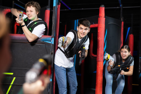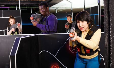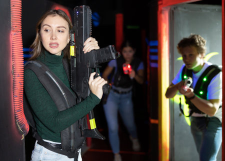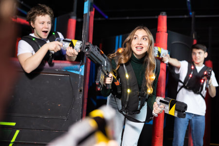 Joyous girl with laser pistol playing laser tag with friends on labyrinth