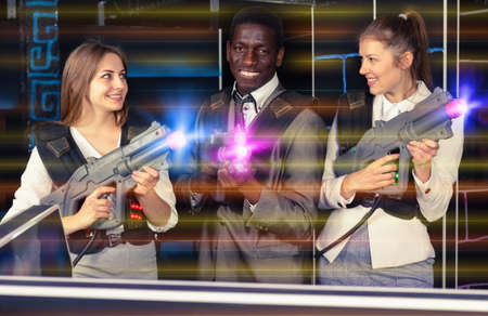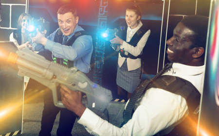 Positive smiling men and women in business suits playing laser tag emotionally in dark room
