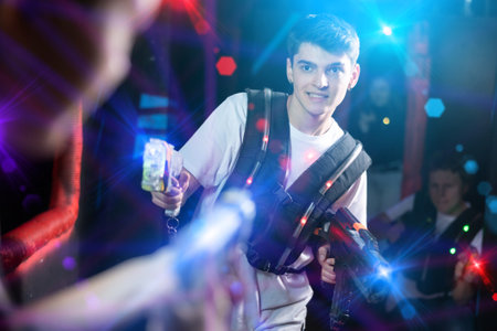 Emotional man with laser pistol playing laser tag with friends on dark labyrinth
