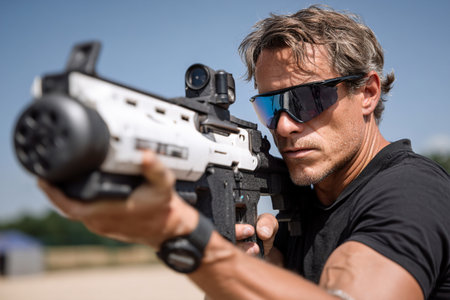 A shooter tests a rifle in a dynamic skilled outdoor setting. The scene captures precision and intensity, highlighting the importance of training and focus during operations.