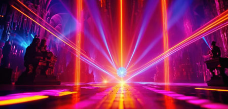 Fun in night club with laser light. Silhouetted Figures at Futuristic Light Show with Glowing Particles