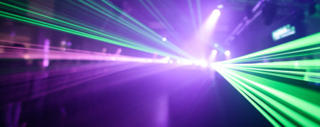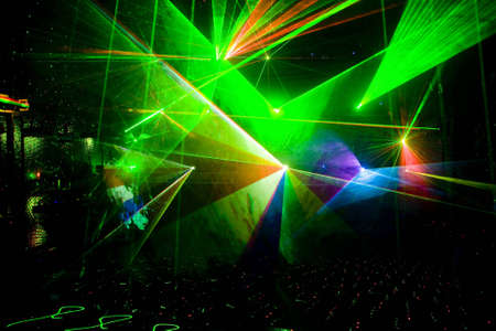 Bright laser light show with vivid colors in dark room