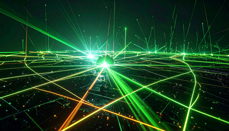 Bright green neon laser lights illuminate the darkness creating lines and triangle shapes in sci-fi effect.