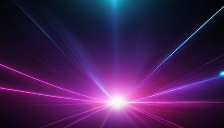 Abstract background with lights burst. Laser rays and fog over starry dark background. Party light or super nova star sunburst effect. Futuristic vibrant abstract template with glowing ascending lines