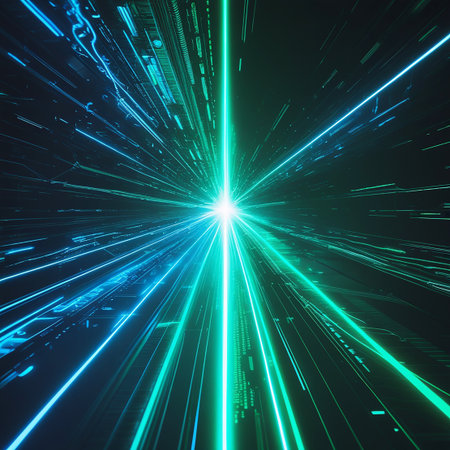 A brilliant starburst of blue and green light trails radiates outwards, suggesting immense speed and digital energy in a dark void.
