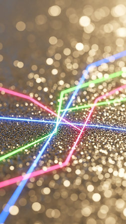 Abstract neon light trails in blue, pink, and green intersect over a sparkling golden glitter background with bokeh lights.
