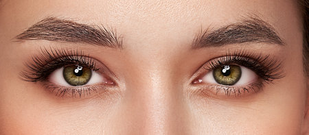 eye of woman or girl, brown color, with long eyelashes and eyebrow on young face skin. No makeup. Natural beauty. Sight. Vision. Ophthalmology