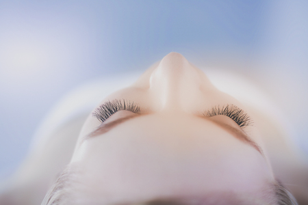 Eyelash Extension Procedure. Woman Eye with Long Blue Eyelashes. Ombre effect. Close up, selective focus.