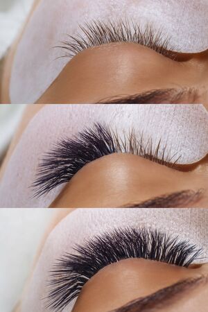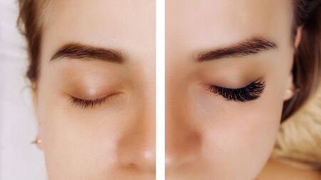 Before and after eyelash extension procedure. Beautiful and expressive eyes of young woman with fake long lashes