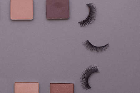Set for eye lash extension on trendy gray background. Fake eyelashes, mascara brush, Beauty stylish seamless pattern concept, makeup cosmetics. Banner for site, header