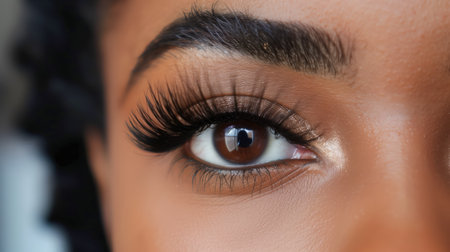 Close up photo of a African American womans eye with long lashes. beautiful eye with long, thick eyelashes and well-groomed eyebrow natural makeup and beauty.