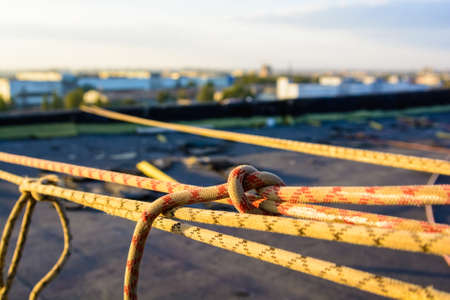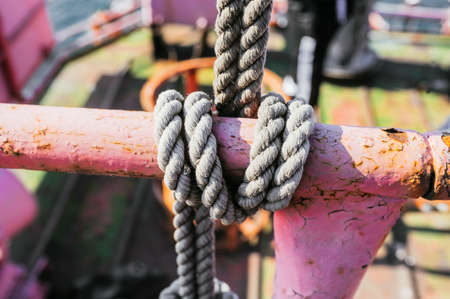 Close-up knot rope tied around stake on boat or ship, boat mooring rope.