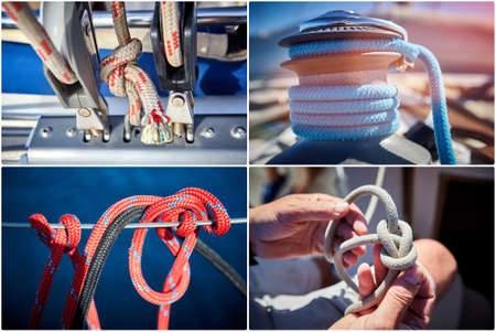Close up of yacht equipment. Part of yacht with red ropes and capstan. Sailing boat pulley with nautical rope. Marine background.