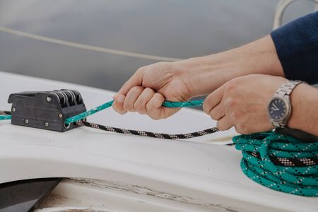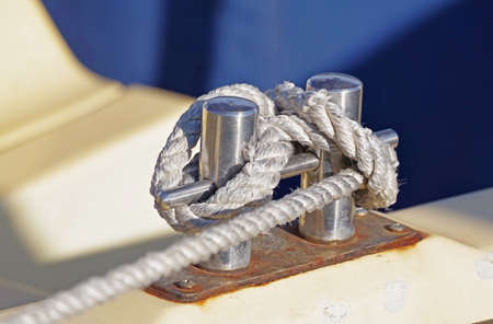 Rope on a yacht. Yacht rope cleat and sunlight. Sailboat winch and rope yacht detail. Yachting.
