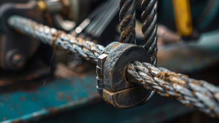 Detailed close-up of a metal cable knot used in sailing, showcasing texture and design against a serene sky backdrop, perfect for marine-themed projects.