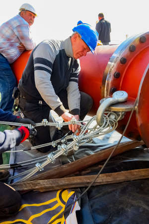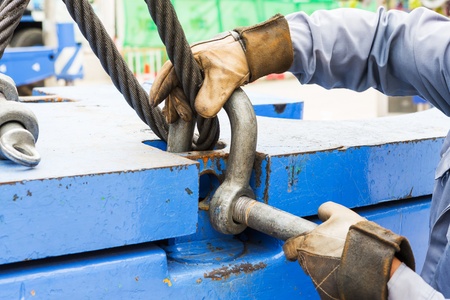 Close up worker fitting bolt anchor shackle with wire rope sling on crane counter weight