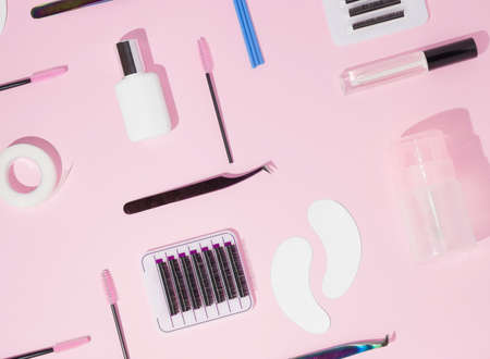Things for the work of lash-makers, artificial eyelashes, microbrachis, glue, tweezers, combs, brushes for eyelash extensions. Eyelash extension, painting of eyebrows. Top view, pink background.