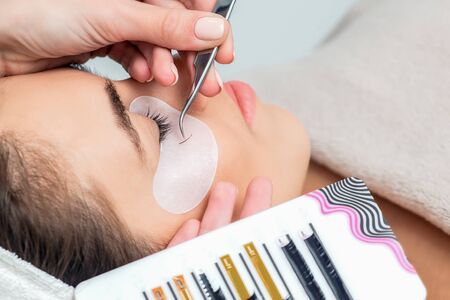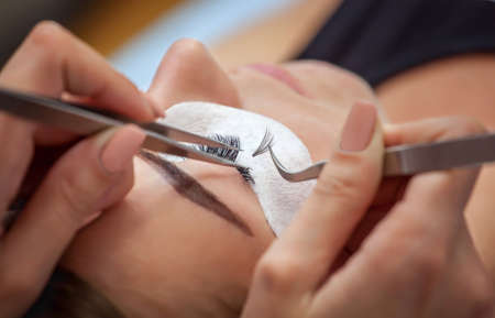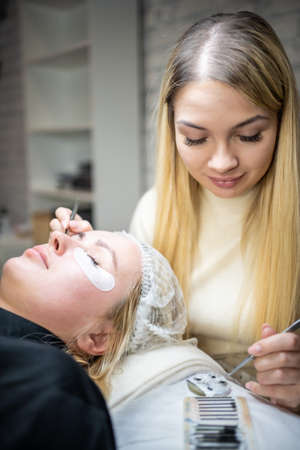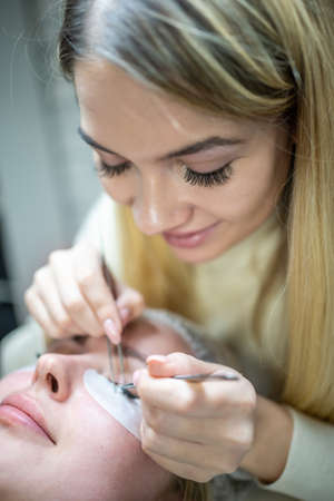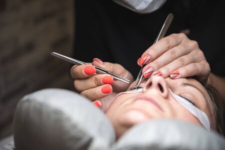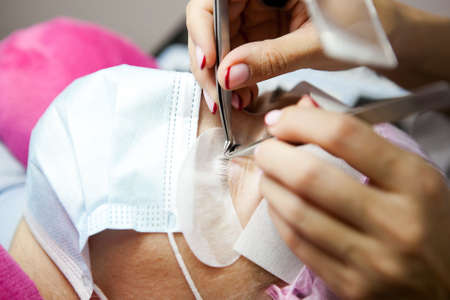 professional beautician with tweezers makes eyelash extension for beautiful woman in beauty salon.