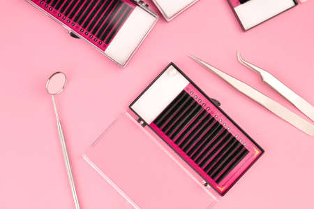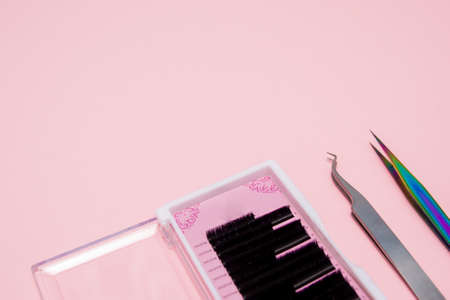 set accessory cosmetics for artificial or fake eyelashes, metal tweezers, copy space, pink background.