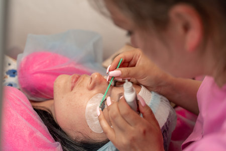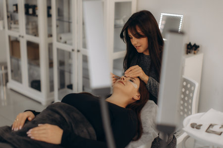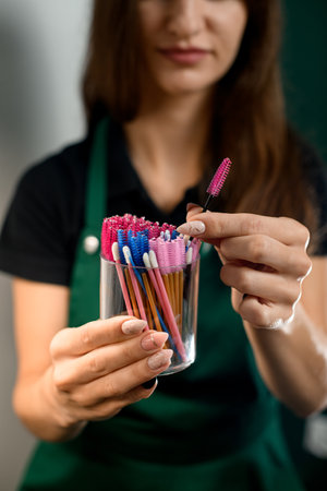 Close up of an unrecognizable makeup artist combs eyebrows with a micro brush after eyebrow lamination proces at the beauty salon.