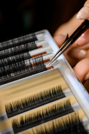 close-up view on box with artificial eyelashes. Cosmetician takes eyelashes with tweezers