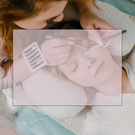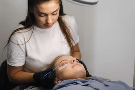 Beautician making eyelash lamination procedures for young model. Modern eyelash care procedures laminating and extension for lashes. Professional beauty studio