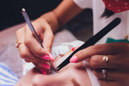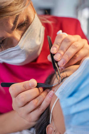 Master making fake long lash Eyelash extension procedure with tweezers for woman