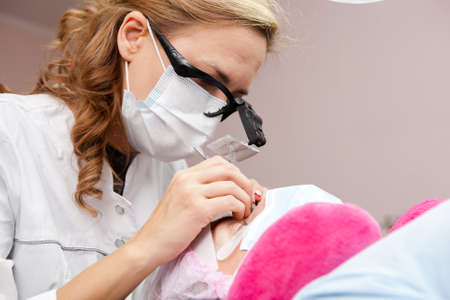 A girl tattoo artist holds pigments in her hand with which she will perform the procedure of permanent makeup