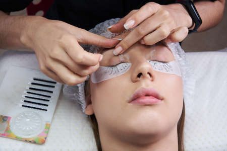 Beautician making eyelash lamination procedures. Modern eyelash care treatment procedures - staining, curling, laminating and extension for lashes. Professional beauty salon.