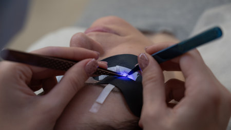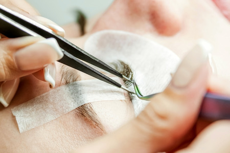 An eyelash extension specialist uses tweezers to secure the lash. Close-up of a cosmetic procedure to increase the eyelashes