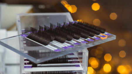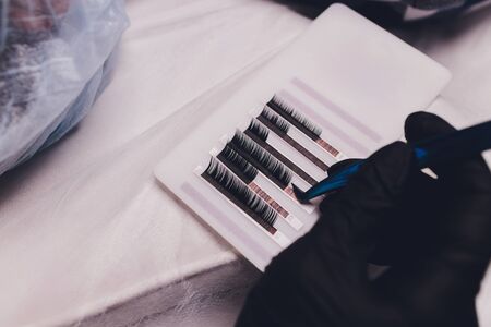 Eyelash Extension Procedure. Close-up of a master at work artificial eyelash extensions material. Hands of the master taking lashes from the set