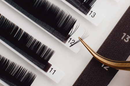 Bunch of artificial eyelashes in tweezers. Extensions of artificial eyelash, process close up. Woman in a beauty salon. Beauty and self-care.