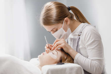 A girl makes the procedure for extending eyelashes during a pandemic, a master with tools in his hands