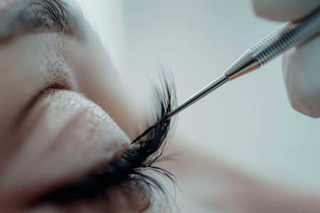 A close-up view captures a skilled professional applying eyelash extensions to a client's lashes, highlighting attention to detail and precision in a soothing salon atmosphere.