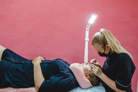 Master lashmaker, diligently extends eyelashes to the client, on the couch, in the beauty salon. A beauty master, a girl of 30 years old, European appearance, at work, in a bright room
