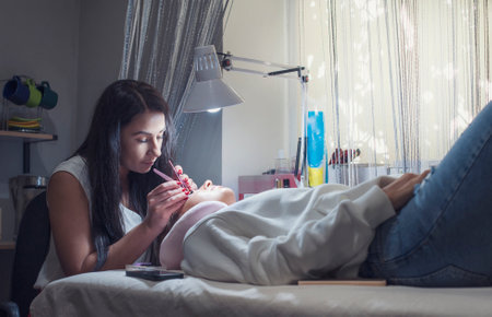 Beautician providing eyelash extension service to a young woman client lying down during beauty treatment in a modern salon