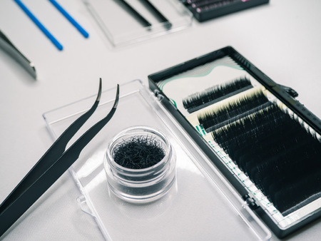 close up of equipment for eyelash extensions in beauty salon,tools ,tweezers,patches,false lashes