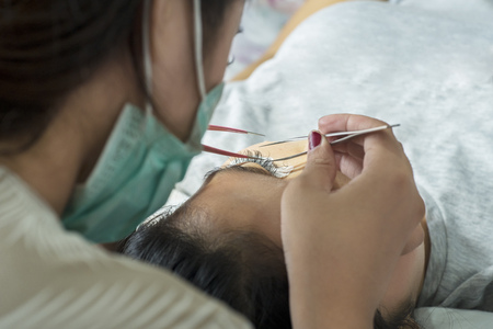 Treatment beauty procedure of upgrade Eyelashes Extension with tweezers Woman Eyes with long extended lashes