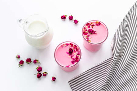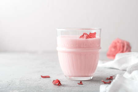 Glass of moon milk with a roses on on light concrete. Ayurvedic relaxing drink for the night.