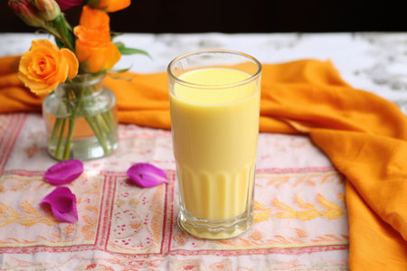 saffron milk in tall glass on diwali themed tablecloth, created with generative ai