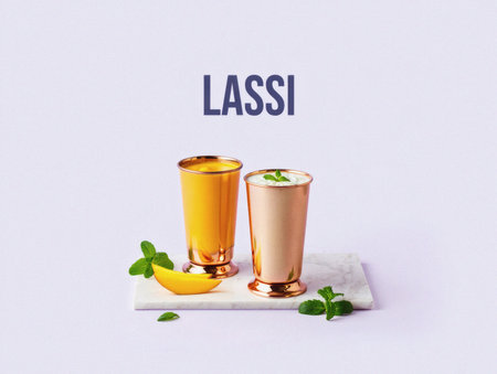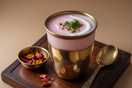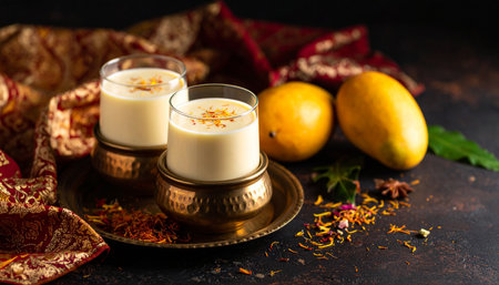Mango lassi in brass bowl with saffron, Indian cloth, cultural aesthetic.