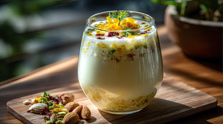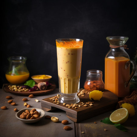 Enjoy a creamy turmeric smoothie served in a glass, beautifully garnished with nuts and spices, set against a stunning vibrant background.
