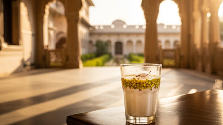 Cinematic wide shot (16:9) of a crystal glass of Thandai garnished with nuts and saffron, set on a d