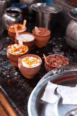 Indian popular drink Lassi (traditional Dahi yogurt-based drink) in clay cup with various topping on the street in Varanasi.