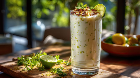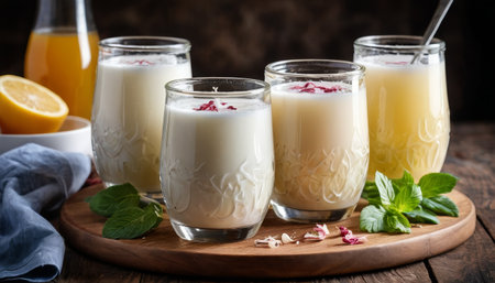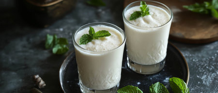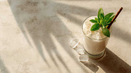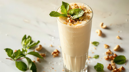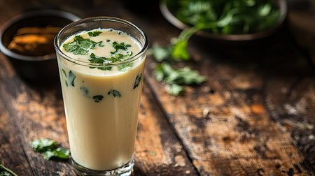 Refreshing milk drink with creamy texture and mint garnish in a rustic setting